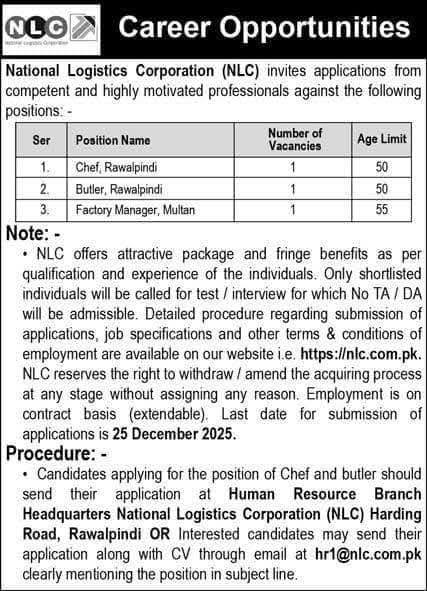 National Logistics Corporation (NLC) is hiring for key positions including Chef, Butler, and Factory Manager in Rawalpindi and Multan. Apply now for exciting career opportunities with attractive packages and benefits. The deadline for application submission is December 25, 2025.