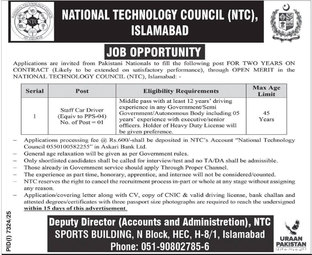 National Technology Council NTC Islamabad jobs 2026 announced for Staff Car Driver PPS-04. Check eligibility, experience requirement, age limit, application fee and deadline for NTC government jobs.