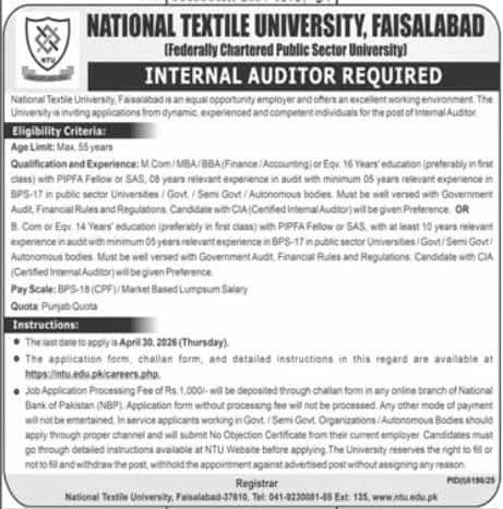 National Textile University (NTU) Faisalabad is hiring an Internal Auditor (BPS-18). Candidates with M.Com, MBA, or BBA Finance and relevant audit experience in the public sector are encouraged to apply. Submit your application by April 30, 2026.