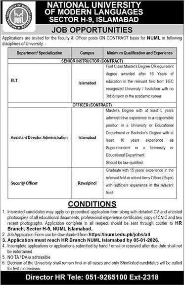 NUML Islamabad and Rawalpindi announce 2025 faculty and officer positions for Senior Instructor in ELT, Assistant Director Administration, and Security Officer. Apply by January 5, 2026.