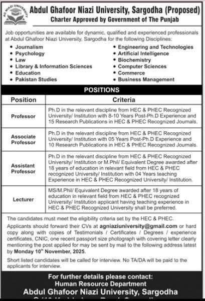 Exciting Faculty Jobs and Staff Vacancies are open at Abdul Ghafoor Niazi University (Niazi Medical College) Sargodha for 2024-2025. Apply now for Lecturer, Professor, and Administrative Posts. Find eligibility criteria and last date to apply.
