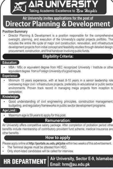 Apply for the Director Planning & Development position at Air University, Islamabad. The role requires 15 years of experience in planning and development, with expertise in civil engineering and public sector projects. Submit your application now to be part of a prestigious university.