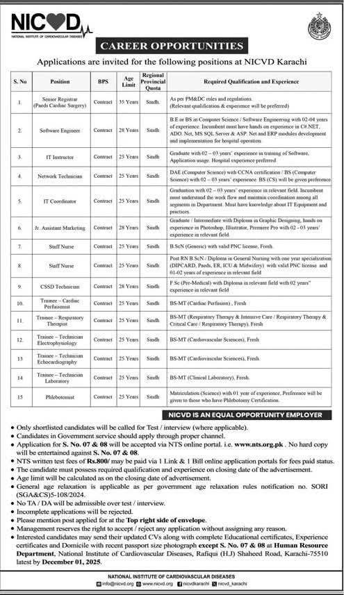 “Explore career opportunities at NICVD Karachi. Apply for positions like Senior Registrar, Software Engineer, IT Coordinator, and more. Submit your applications by December 01, 2025.”