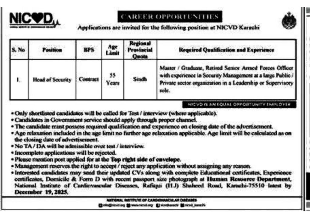 “Apply for the position of Head of Security at NICVD Karachi. Ideal candidates should have a Master’s degree or be a retired Senior Armed Forces Officer with experience in security management. The application deadline is December 19, 2025.”