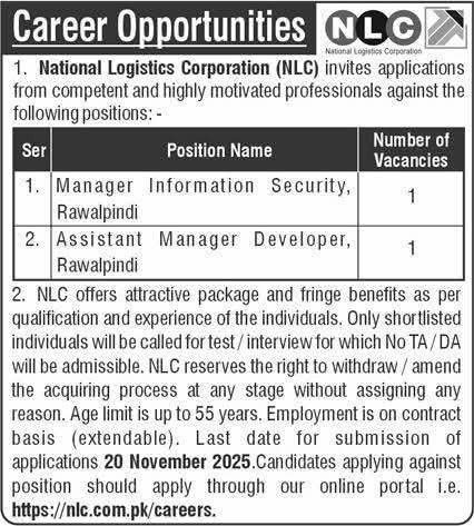 National Logistics Corporation (NLC) is hiring highly motivated professionals in Rawalpindi! Apply for Manager Information Security and Assistant Manager Developer jobs. Attractive packages, fringe benefits, and contracts up to age 55. Apply online at nlc.com.pk/careers by 20 November 2025.
