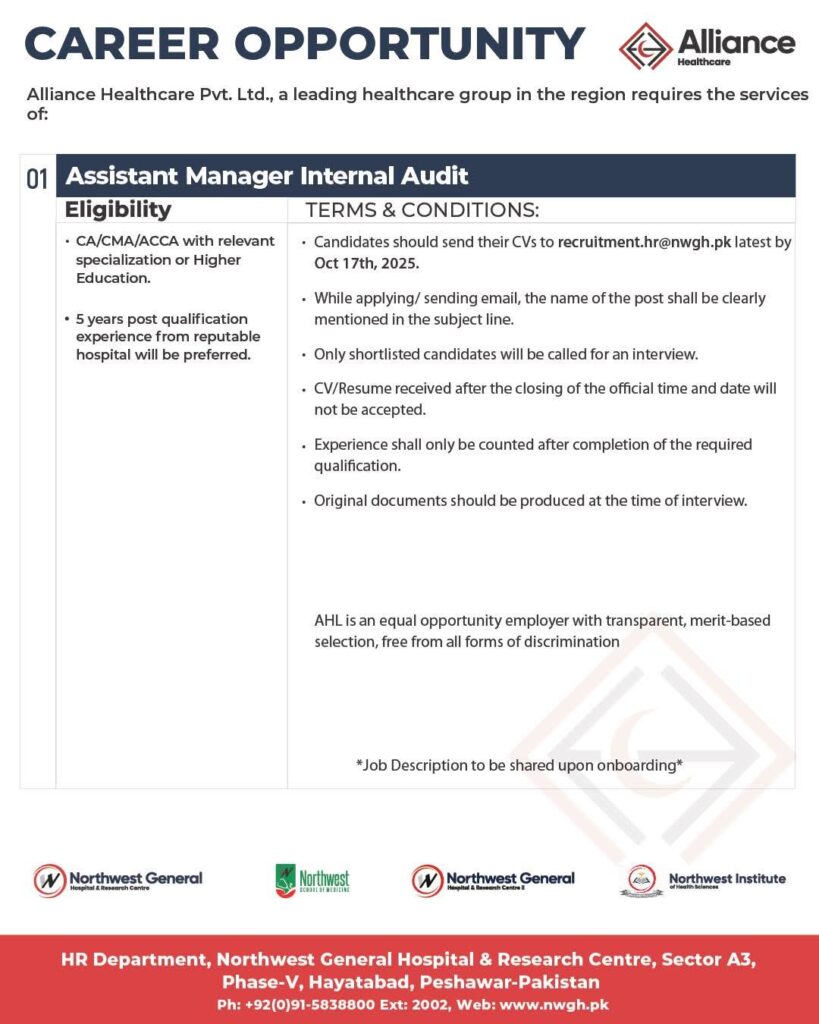 Assistant Manager Internal AuditCA/CMA/ACCA with relevant specialization or Higher Education. 5 years post-qualification experience from reputable hospital preferred.Candidates should send CV to recruitment.hr@nwgh.pk by Oct 17th, 2025. Only shortlisted candidates will be called for an interview. CV/Resume received after the deadline will not be accepted. Experience counted only after completion of the required qualification. Original documents required at interview.Oct 17th, 2025
