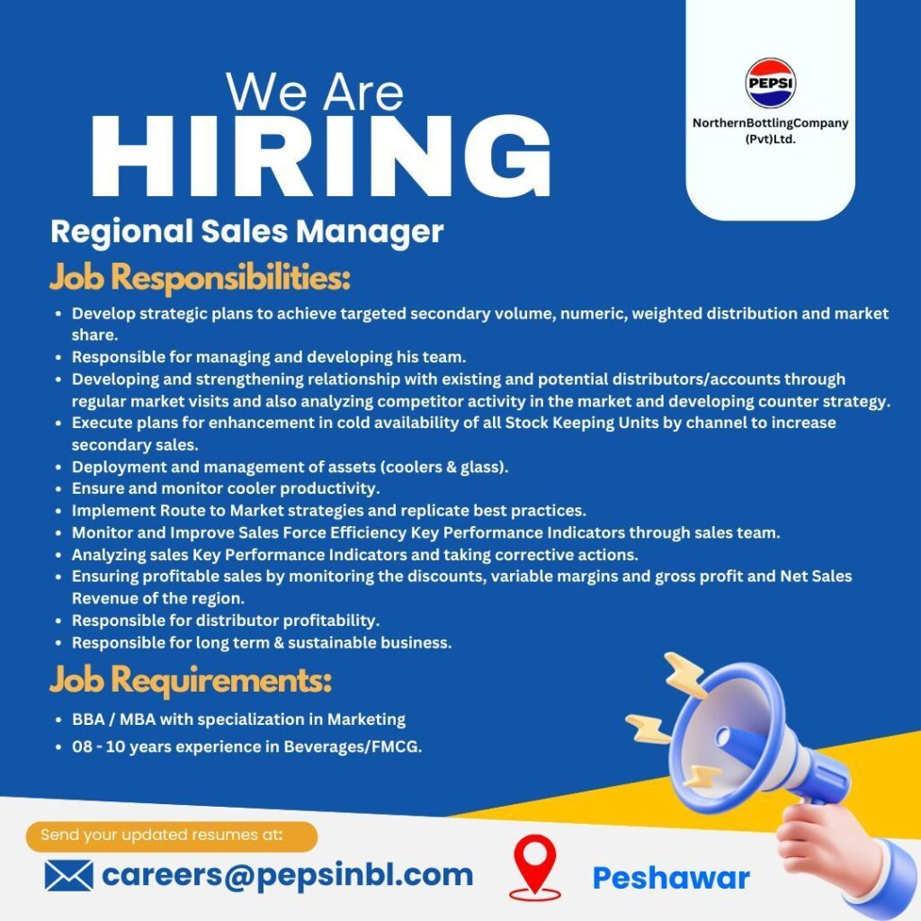 Join Northern Bottling Company (Pepsi) in Peshawar as a Regional Sales Manager. Seeking MBA/BBA graduates with 8-10 years of FMCG experience. Apply today!