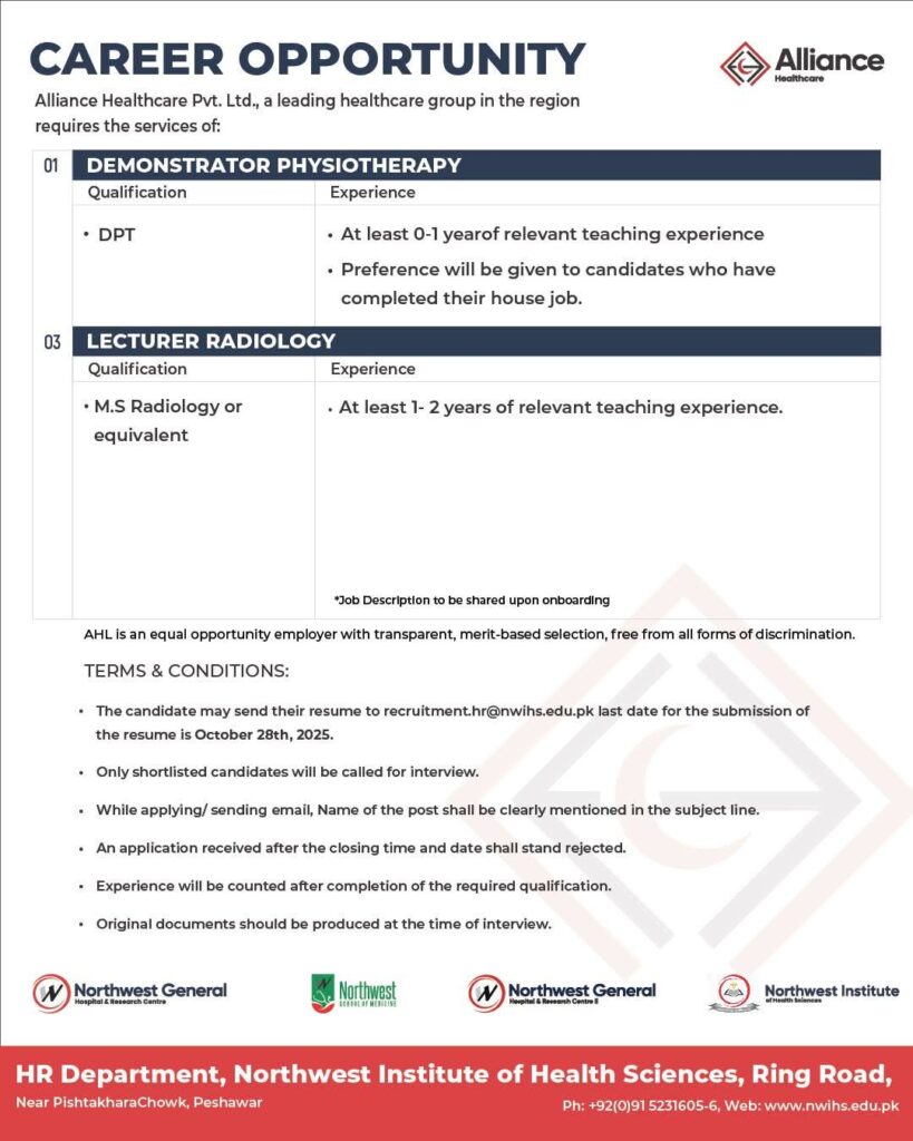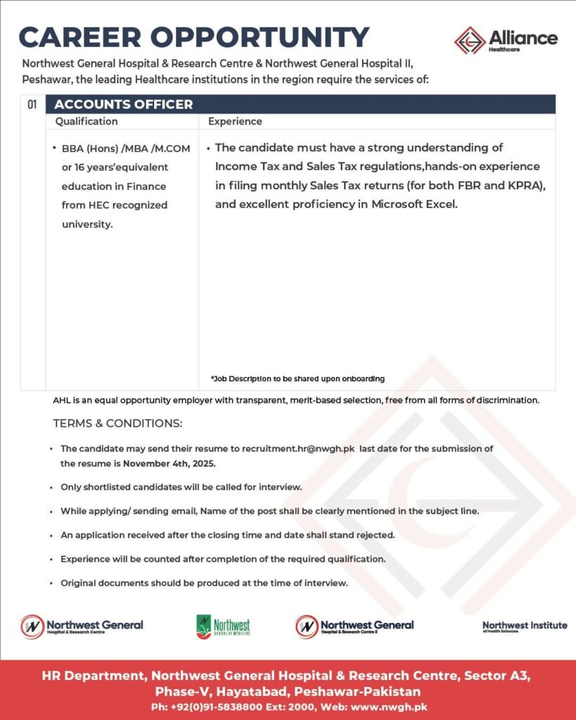 - Email: Send your resume to recruitment.hr@nwiht.edu.pk for healthcare positions and recruitment.hr@nwgh.pk for the Accounts Officer role.
