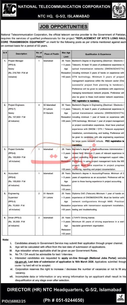 National Telecommunication Corporation NTC announces project based jobs 2026 including Project Manager, Project Engineers, Project Controller, Accountant, Engineering Supervisor and Driver. Check eligibility and apply before deadline.