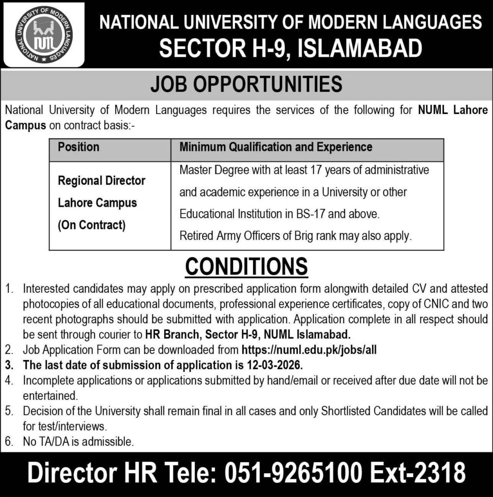 | Regional Director | NUML Lahore Campus | Contract | Master’s Degree (HEC recognized) | At least 17 years administrative & academic experience in a university or educational institution (BS-17 or above level). Retired Brigadier rank officers may also apply. | 01 |