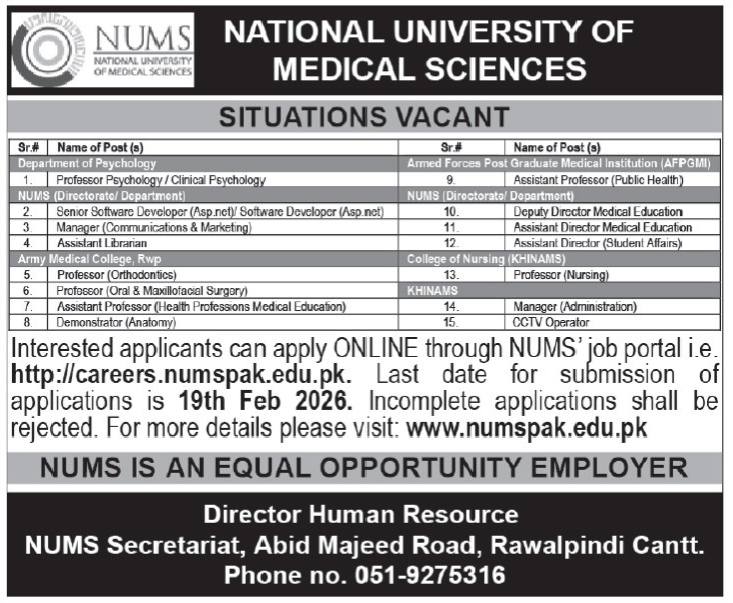 NUMS jobs 2026 announced for professors, developers, managers, and nursing faculty. Check posts, eligibility, and apply online before 19 Feb 2026.