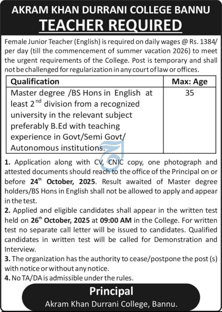 “Apply for the Female Junior Teacher (English) position at Akram Khan Durrani College, Bannu. Competitive daily wages of Rs. 1384/day until Summer 2026. Apply by 24th October 2025 .”