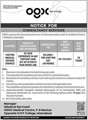 Apply for OGDC consultancy jobs 2026 in Islamabad. Vacancy available for Visiting Medical Officer (Female) at OGDC Medical Centre. Competitive per-visit fee. Apply within 15 days.