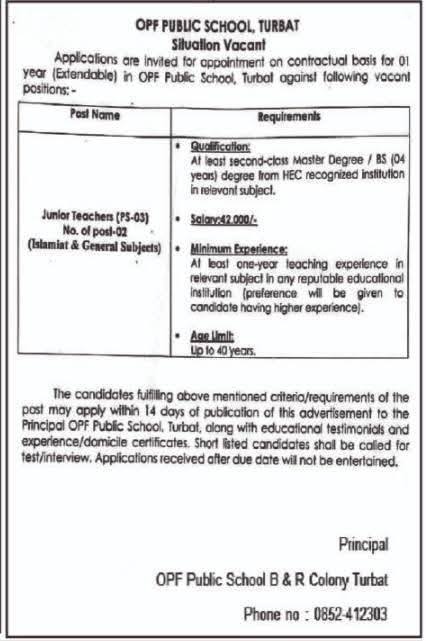 Apply for OPF Public School Turbat Jobs 2026 for Junior Teacher (PS-03) posts in Islamiat and General Subjects. Check eligibility criteria, qualification, experience, salary, age limit, and application procedure.