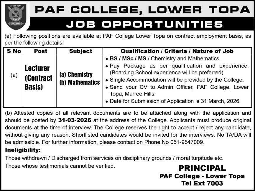 PAF College Lower Topa Murree jobs 2026 announced for Lecturer (Chemistry and Mathematics) on a contract basis. Check eligibility, qualifications, application process, deadline, and job details for teaching jobs in Murree.