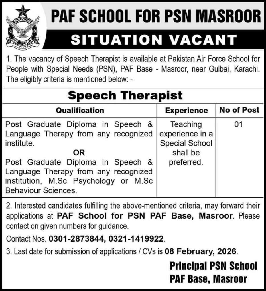 | Speech Therapist | 1 | PG Diploma in Speech & Language Therapy OR PG Diploma + MSc Psychology / MSc Behaviour Sciences | Teaching experience in a special school preferred | PAF Base Masroor, Karachi |