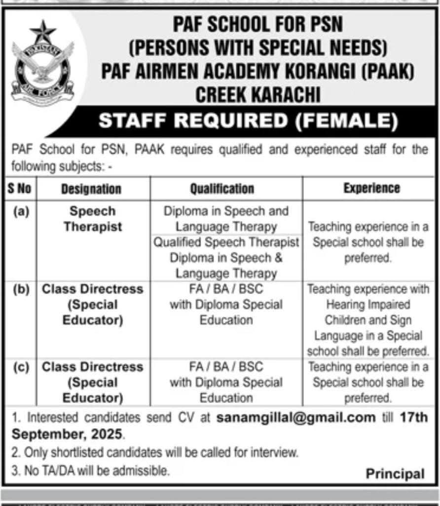 PAF School Jobs 2025, Special Education Jobs Karachi, Female Teacher Jobs PAF, Speech Therapist Jobs Pakistan, Class Directress Vacancy, PAF PSN Jobs Korangi, Special Needs School Karachi Jobs, Teaching Jobs for Women in Karachi, Special Educator Career Pakistan.
