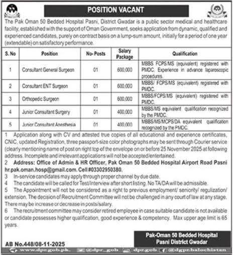 Pak Oman 50 Bedded Hospital Pasni, Gwadar, seeks Consultant (General Surgeon, ENT, Orthopedic) and Junior Consultant (Surgery, Anesthesia) on a contract basis with a lump-sum salary. Requires MBBS/FCPS/MS registered with PM&DC. Max age 65. Apply with CV by 25 November 2025 via courier.