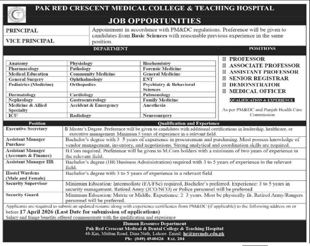 Apply for Pak Red Crescent Medical College & Teaching Hospital careers 2026. Multiple vacancies for Professors, Medical Officers, Assistant Managers, and Security Staff in Lahore. Competitive salary and benefits offered. Apply by April 17, 2026.