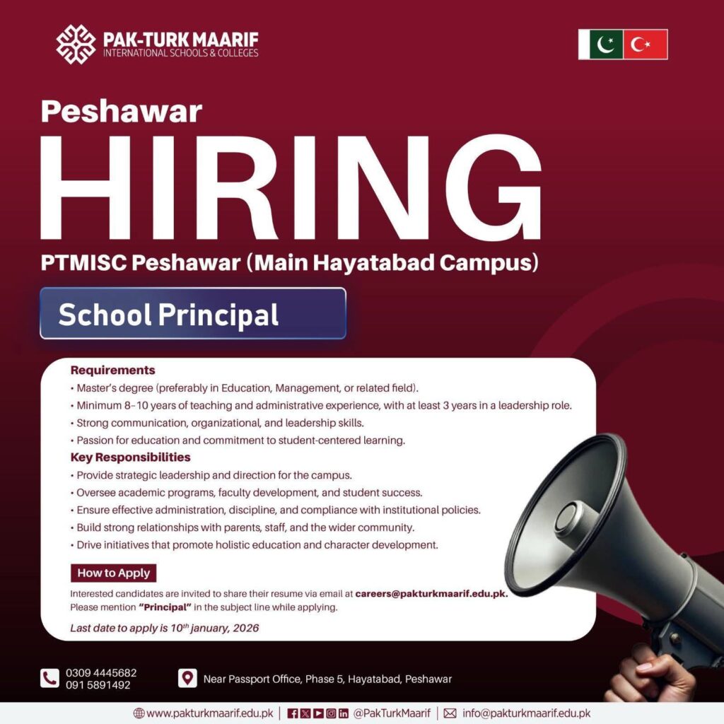 Apply for Pak-Turk Maarif Schools Peshawar Jobs 2026. Latest opening for School Principal at Main Hayatabad Campus. Ideal opportunity for experienced education leaders seeking senior academic roles.