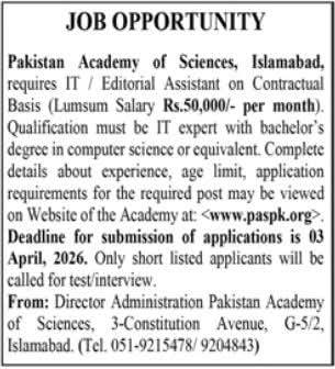 Apply for the IT / Editorial Assistant job at the Pakistan Academy of Sciences, Islamabad. 2026 vacancy offering a Rs. 50,000 monthly salary. Check eligibility, required computer science degree, and the April 3rd deadline.