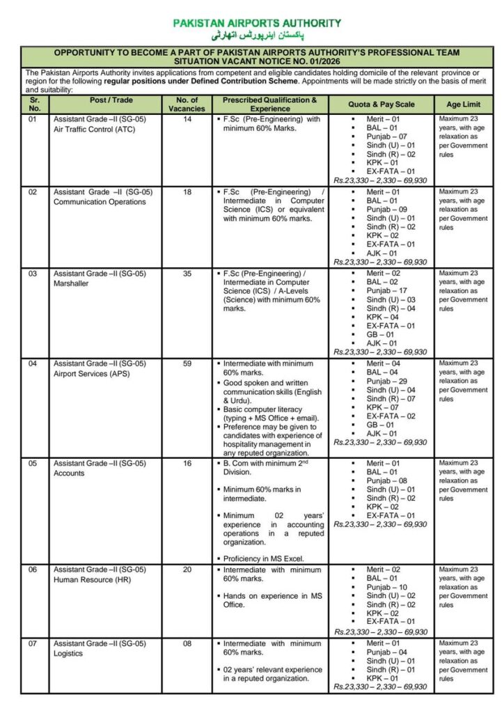 | 1 | Assistant Grade-II Air Traffic Control (ATC) | 14 | F.Sc Pre-Engineering with minimum 60% marks | Not required | Max 23 years |