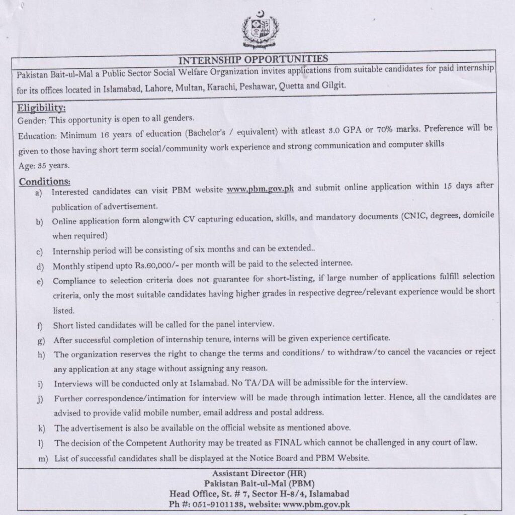 Pakistan Bait-ul-Mal (PBM) announces paid internship opportunities 2026 for graduates across major cities. Monthly stipend up to Rs. 60,000. Apply online within 15 days of advertisement publication.
