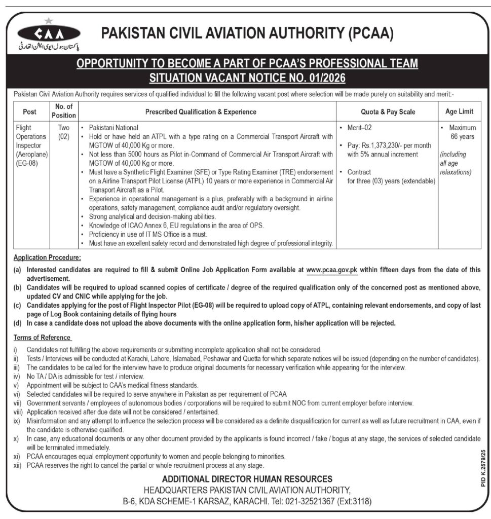 Pakistan Civil Aviation Authority PCAA jobs 2026 for Flight Operations Inspector. Check qualifications, flying hours, age limit, pay scale, and online application steps.