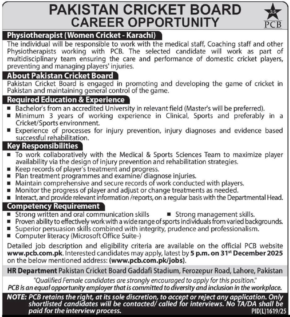 Apply for Pakistan Cricket Board jobs 2025 in Karachi. PCB invites applications for Physiotherapist (Women Cricket) position. Ideal opportunity for sports physiotherapy professionals with clinical and sports injury management experience. Check eligibility, responsibilities, and apply online before 31 December 2025.
