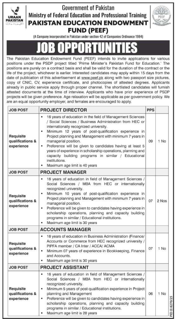 Apply for PEEF Jobs 2025 in Pakistan. Explore Project Director, Project Manager, Accounts Manager, and Project Assistant vacancies with eligibility criteria, qualifications, experience, and application details. Contract-based government jobs with competitive PPS scales.