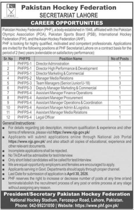 Apply for Pakistan Hockey Federation PHF Jobs 2026 in Lahore. Explore multiple vacancies, eligibility criteria, qualifications, experience, deadline, and application process for government sports sector jobs.