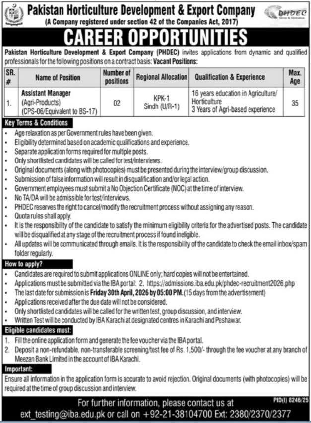 Apply for PHDEC Jobs 2026 for Assistant Manager (Agri Products). Check eligibility, qualifications, experience, number of posts, deadline, and application process. Low competition government horticulture jobs in Pakistan.