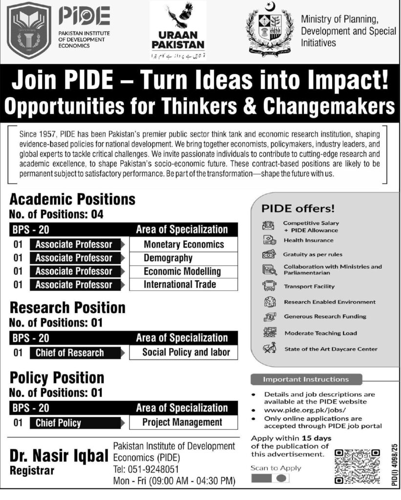 “Apply for academic and research positions at Pakistan Institute of Development Economics (PIDE). Join PIDE as an Associate Professor, Chief of Research, or Chief of Policy. Apply by December 2025.”