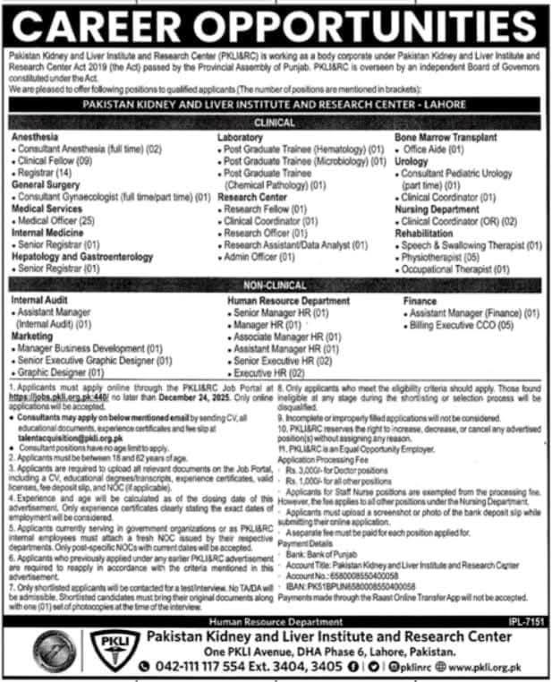 Join Pakistan Kidney and Liver Institute and Research Center (PKLI&RC) for exciting career opportunities in Lahore. Apply for various clinical and non-clinical positions including consultants, medical officers, HR roles, and more. Submit applications before December 24, 2025.