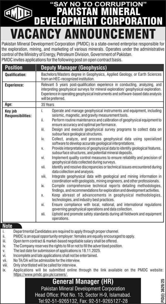 Apply for the latest PMDC Jobs 2025 as Deputy Manager (Geophysics). Pakistan Mineral Development Corporation offers a rewarding career in geology and geophysics. Check qualifications, age limit, experience, and how to apply online before 18 November 2025.