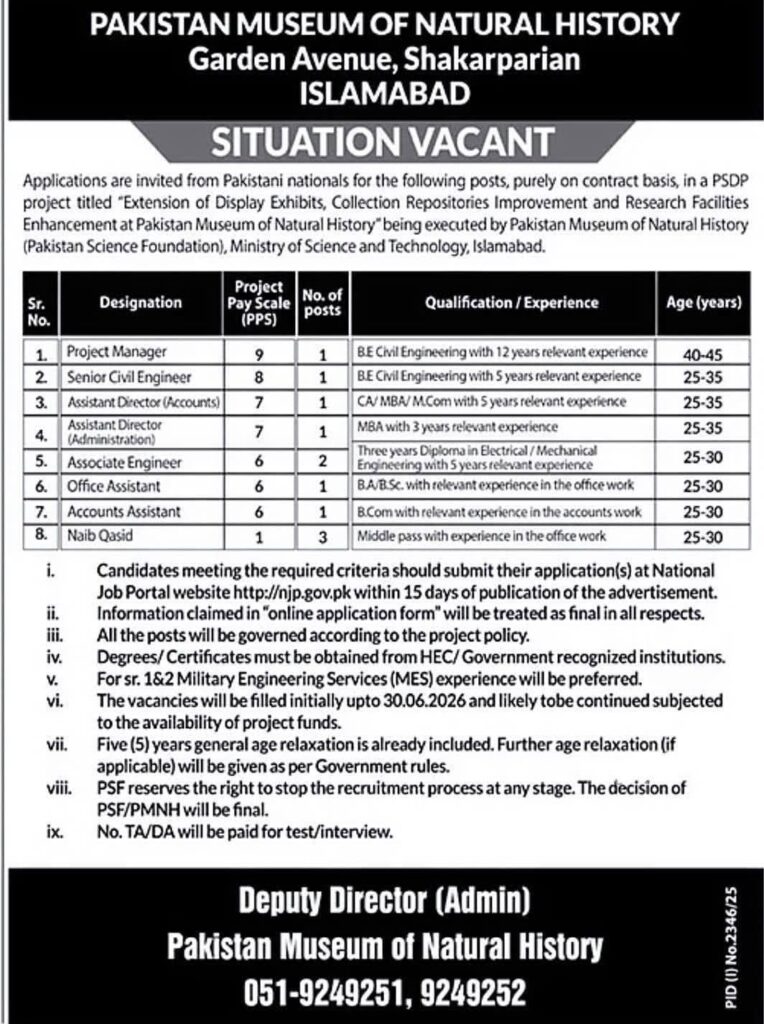The Pakistan Museum of Natural History in Islamabad is seeking qualified professionals for various contract-based positions under the PSDP project. Opportunities include roles for Project Managers, Civil Engineers, and other administrative and technical positions. Apply within 15 days of the advertisement publication on the National Job Portal.