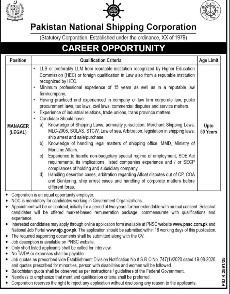 Apply for Pakistan National Shipping Corporation Jobs 2026 for Manager (Legal). LLB/LLM with 15 years corporate and maritime law experience required. Contract-based government shipping job with age limit up to 50 years.