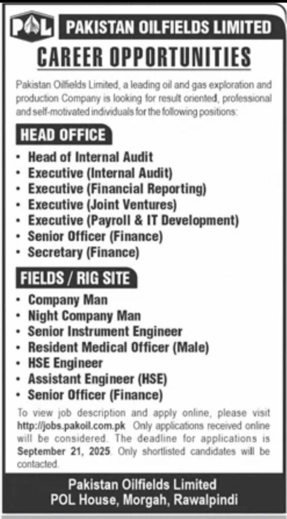 Pakistan Oilfields Limited (POL), a leading name in oil and gas exploration and production in Pakistan, is inviting applications from highly motivated, result-oriented, and experienced professionals for multiple vacancies at both its Head Office in Rawalpindi and Field/Rig Sites.
