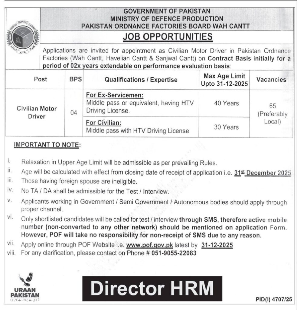 Pakistan Ordnance Factories is hiring Civilian Motor Drivers for multiple locations including Wah Cantt, Havelian Cantt, and Sanjwal Cantt. Apply for these positions with a valid HTV driving license. Age limit is up to 30 years for civilians and 40 years for ex-servicemen. Contractual position with performance-based extension. Apply through POF website before 31st December 2025.