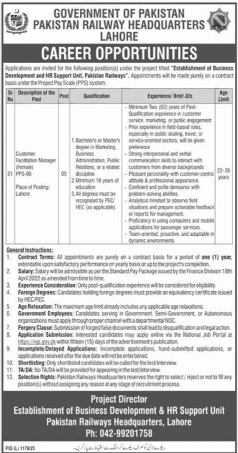 Apply online for the latest Pakistan Railways Jobs 2025 announced by the Pakistan Railway Headquarters Lahore. Exciting opportunity for Customer Facilitation Managers (PPS-06) under the Establishment of Business Development and HR Support Unit Project. Learn about eligibility, qualifications, and application details here!