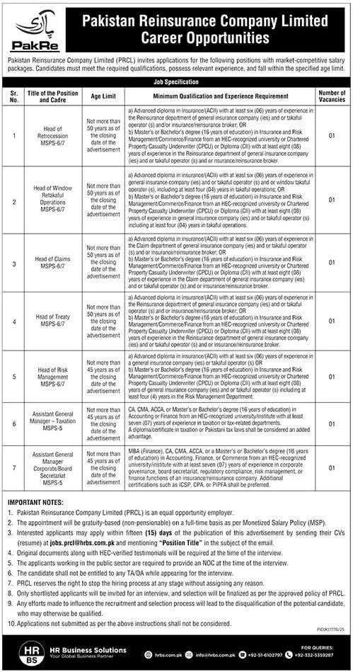 PakRe is hiring 7 Senior Management (Heads & AGMs) for Reinsurance, Takaful & Corporate roles (MSPS-6/7). Requires 8-10 years specialized experience. Apply within 15 days.