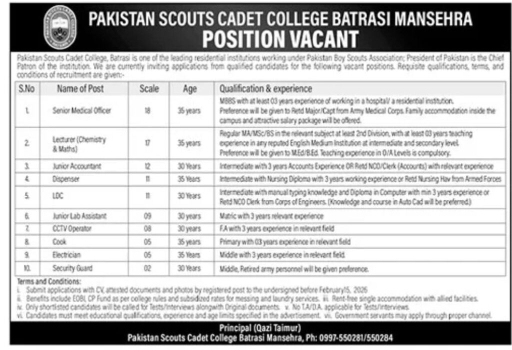 Pakistan Scouts Cadet College Batrasi Mansehra jobs 2026 for lecturer, medical officer, accountant, lab, CCTV, and support staff. Apply before 5 Feb 2026.