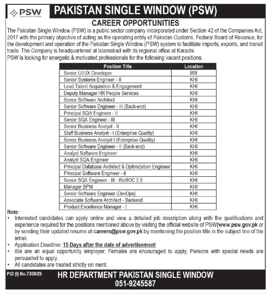 Pakistan Single Window (PSW) announces multiple IT and management job opportunities including software engineers, UI/UX developers, database architects, HR managers, and business analysts. Explore PSW jobs 2026 eligibility, positions, and application details.
