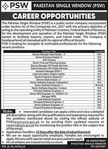 “Pakistan Single Window (PSW) is hiring for multiple positions including Deputy Manager, Senior Business Analyst, SVP Finance, Assistant Manager, and more. These roles are available in Karachi and Islamabad. Apply now for a chance to work with a leading public sector company facilitating imports, exports, and transit trade.”