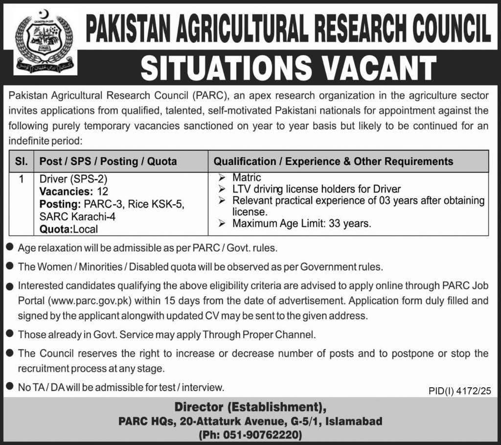 Apply online for PARC Driver Jobs 2025. Pakistan Agricultural Research Council announces new vacancies for drivers with matric qualification and LTV license. Check age limit, eligibility, posting locations and application procedure. Latest PARC career opportunities for Pakistani nationals.