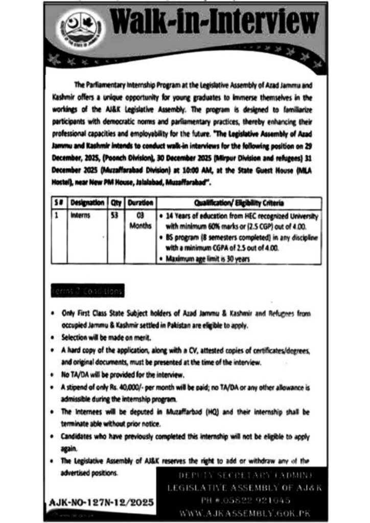 Apply for the Parliamentary Internship Program at the Legislative Assembly of Azad Jammu & Kashmir. Internships are available for young graduates with a BS degree. Apply via walk-in interviews scheduled across multiple divisions in December 2025.