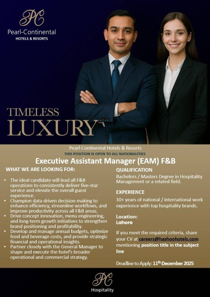 “Pearl-Continental Hotels & Resorts is hiring an Executive Assistant Manager (EAM) for the F&B department in Lahore. If you have 10+ years of experience in hospitality and a degree in Hospitality Management, apply by December 11, 2025.”