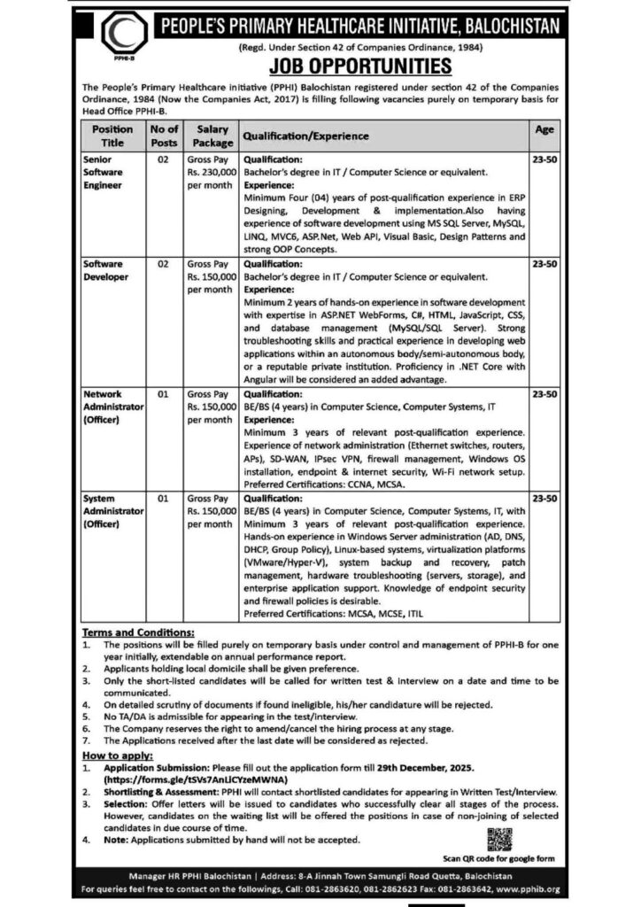 Apply for job openings at People’s Primary Healthcare Initiative (PPHI) Balochistan. Vacancies include Senior Software Engineer, Software Developer, Network Administrator, and System Administrator. Get details on qualifications, salary, and the application process for positions based in Balochistan.