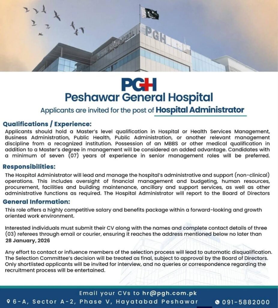 Apply for Peshawar General Hospital Jobs 2026. Vacancy announced for Hospital Administrator with master’s qualification and senior management experience. Competitive salary offered. Last date to apply is 28 January 2026.
