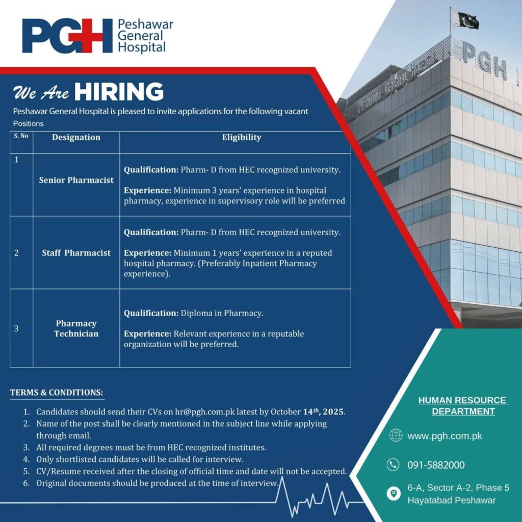 Peshawar General Hospital (PGH) is looking for qualified Senior and Staff Pharmacists and Pharmacy Technicians. Apply by October 14, 2025. Attractive career opportunity in healthcare for Pharm-D and Pharmacy diploma holders.